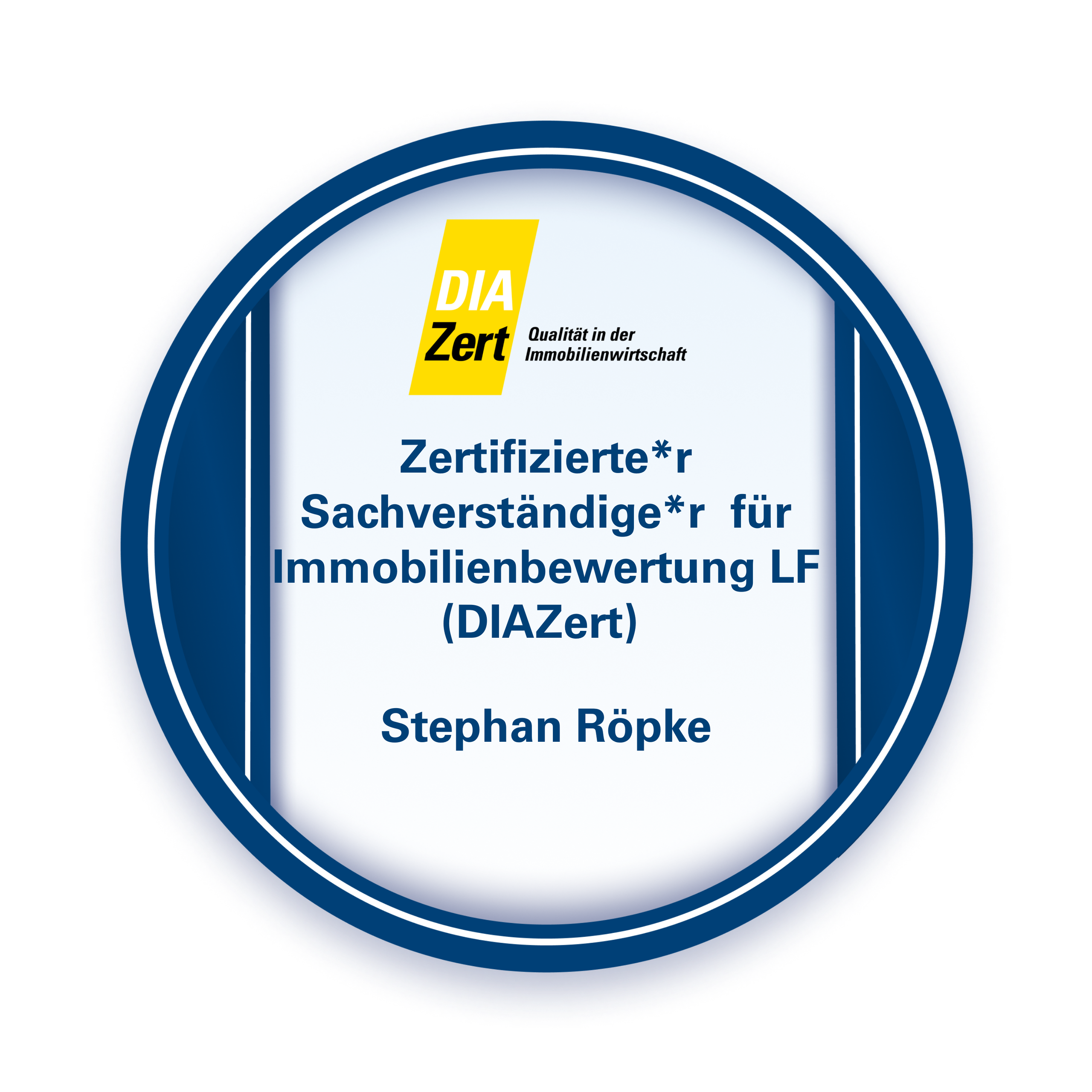 Stephan Röpke ist von der Handelskammer Bremen (IHK für Bremen und Bremerhaven) öffentlich bestellter und vereidigter Sachverständiger für die Bewertung von bebauten und unbebauten Grundstücken und zertifizierter Sachverständiger für alle Immobilienarten (DIA Zert) gem. DIN 17024